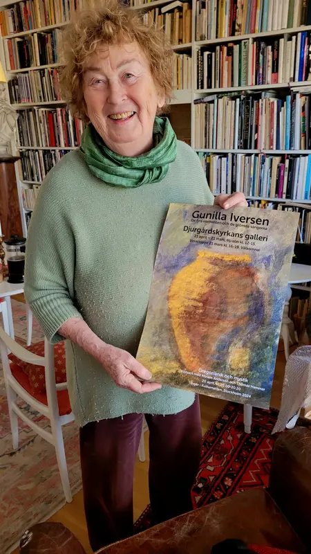 DE FYRA ELEMENTEN OCH DE GAMLA SÅNGERNA är namnet på Gunilla Iversens utställning i Djurgårdskyrkan den 21 mars - 21 april. Konsert med Miriam Andersén och Thomas Hammar 20 april kl 20. Förutom oljemålningar och akvareller visar hon några porträtt i hårdbränd lera som hon gjort efter de sånger hon funnit under sin forskargärning i handskrifter från 800-1200-talen. Tusen år känns plötsligt försvunna på samma sätt som det känns när hon sitter vid det gamla havet i den vänliga skuggan under det tusenåriga gamla olivträdet. Välkomna att se och höra Gunilla berätta. Ring gärna först så kommer hon, 070 952 05 62. Programmakare Gunnel Agrell Lundgren.