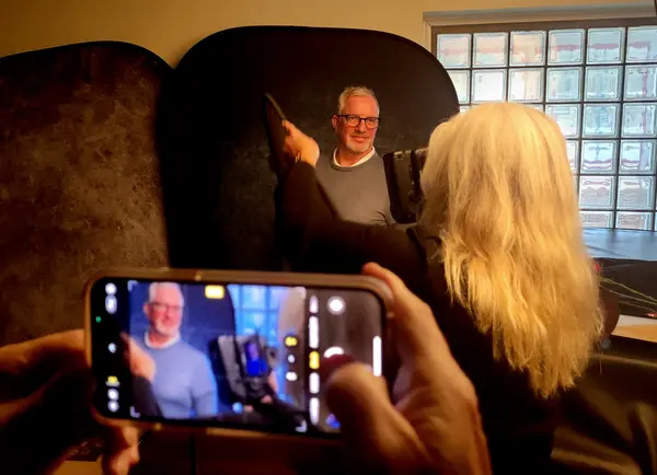 Så här tar Jenny Puronne porträtt. Motivet står mot en mörk skärm. Bygglampa under paraply belyser motivet. I förgrunden syns Lars Ternblads mobilskärm.