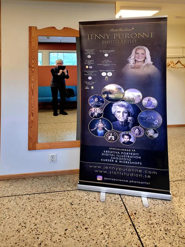 Tyresö Fotoklubbs reklam roll up inför 60-årsjubiléet den 24 mars 2024. Programmakaren Gunnel som fotograferar syns i spegeln.