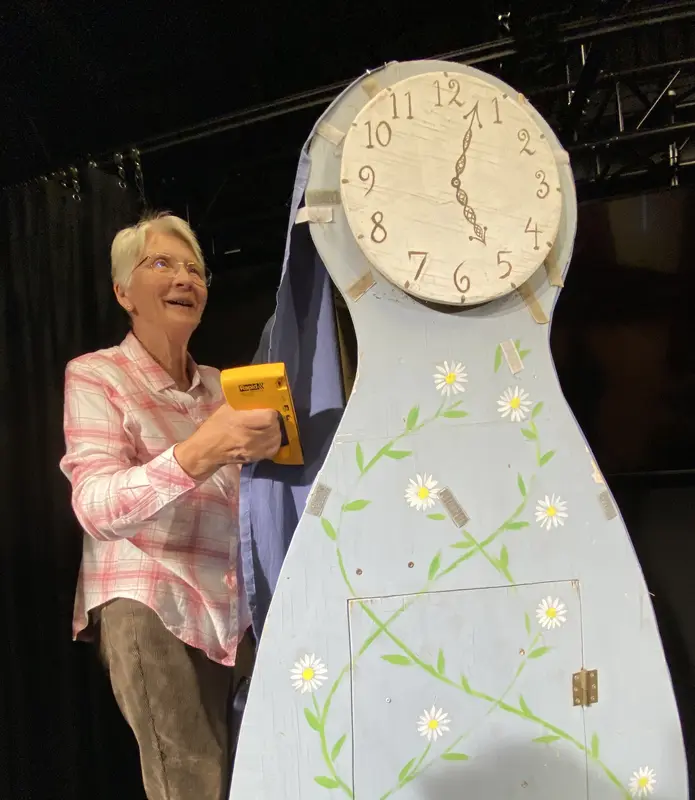 Barbro Lavett som ansvarar för kostym, smink och mycket annat förbereder blomsteruret.