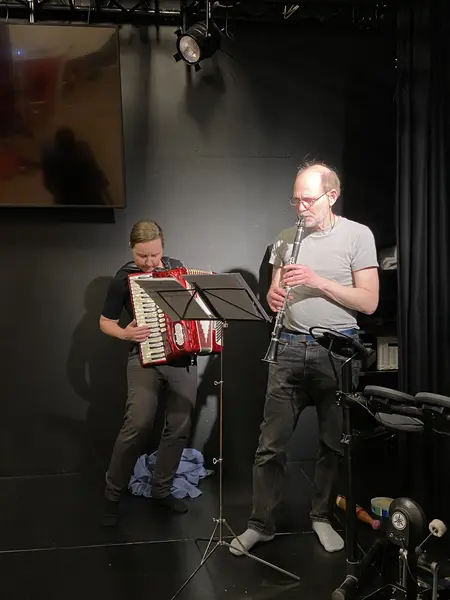 Makarna Karin och Tomas Andreason repeterar musiken till barnteatern Blomsteruret som snart spelas på Kaatach