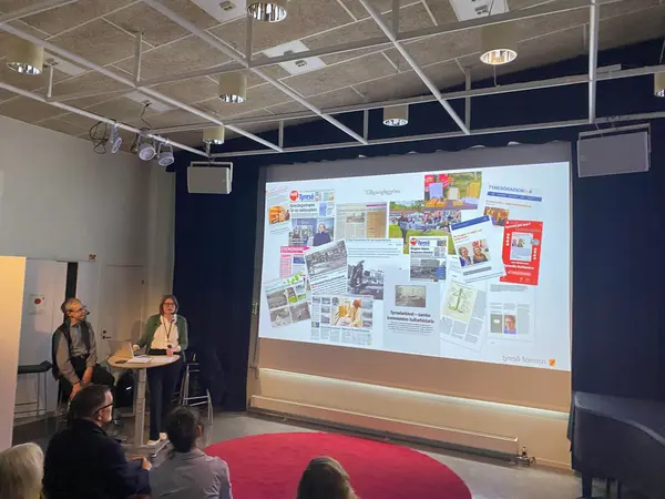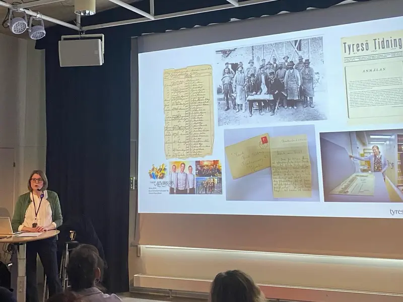Arkivarien Eva Joelsson berättar om Tyresöarkivet som kommunen nu bygger upp. På biblioteket i Tyresö Centrum den 11/4 presenterades arkivet och Lennart Lind visade sin fars fotosamling från 40-talet runt Tyresö gård. Ett välbesökt möte där många Tyresöbor tog chansen att lyssna på hur arkivet nu tar emot bilder och material från privatpersoner, föreningar och företag.