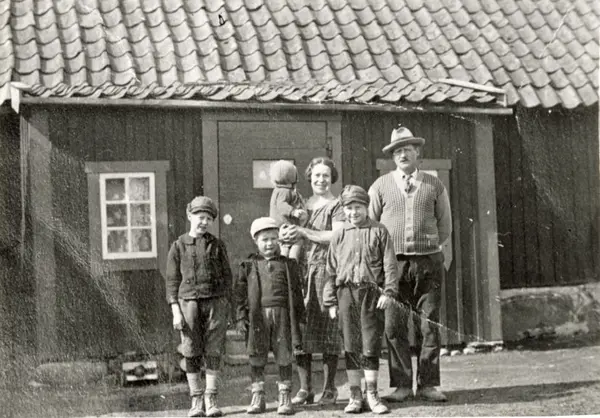 Familjen Lind framför huset i Raksta. Fotograf okänd, 1931.