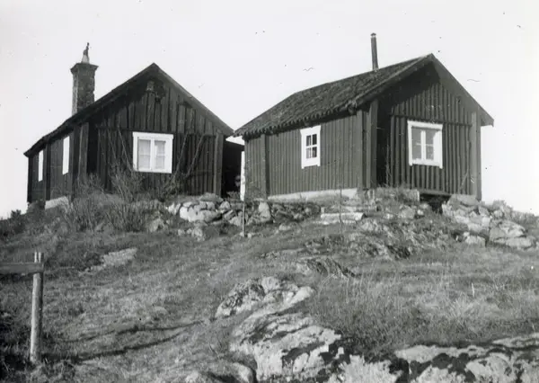 Husen i Raksta. I huset till vänster bodde familjen Lind och i det högra bodde Johan August Jonsson.