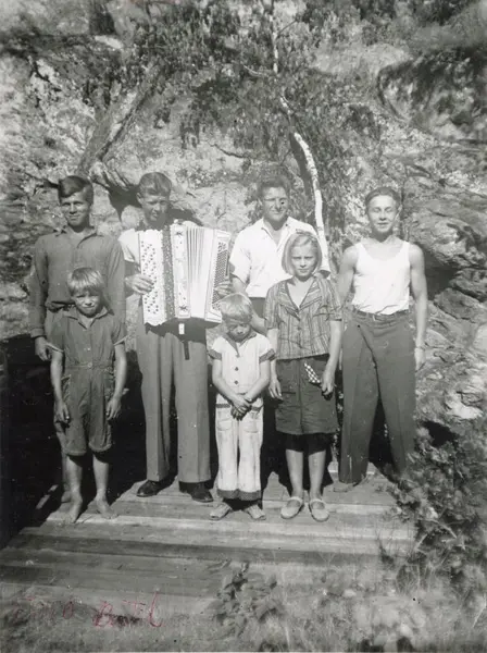 Familjen Lind. Bakre raden från vänster: Gösta och Bertil (med dragspel) Lind. Okänt vilka de två andra killarna i bakre raden är. Främre raden från vänster: Rolf, Sixten och Ingeborg Lind. Bilden är tagen vid Telegrafen, sannolikt 1941.