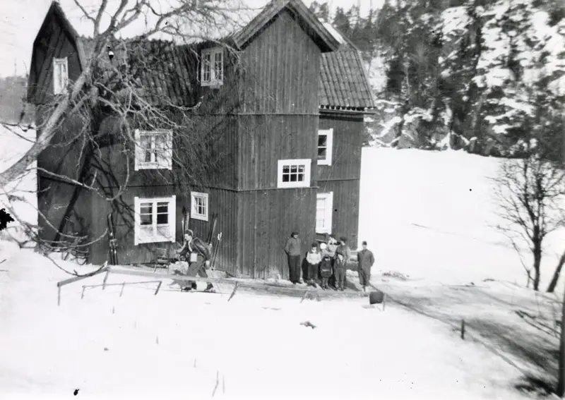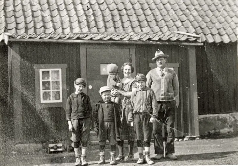 Familjen Lind framför huset i Raksta. Fotograf okänd, 1931.