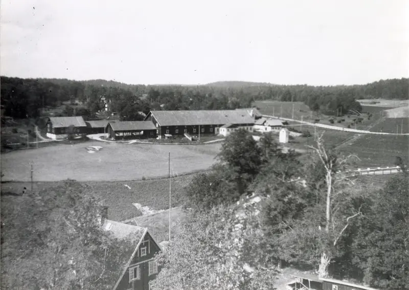Tyresö gård i bakgrunden. Karolinahemmet längst ner till vänster och dess uthuslänga till höger. Fotot taget från kyrktaket. Bild är sannolikt tagen 1941.