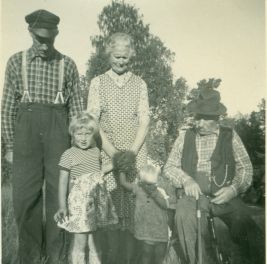 Torpet Skogsäng som familjen Collin byggde år 1900 Till höger sitter Gullan Karlsson (1915-2005) i sin far Gunnar Karlssons (1885-1970) famn. Den minste som sitter i sin mor Amandas famn är Folke Karlsson född 1917. Gunnars bror Elis (1887-1991) sitter på vagnen till vänster. I mitten Gunnars bror Bernhard (1879-1959) tillsammans med en dräng och piga.