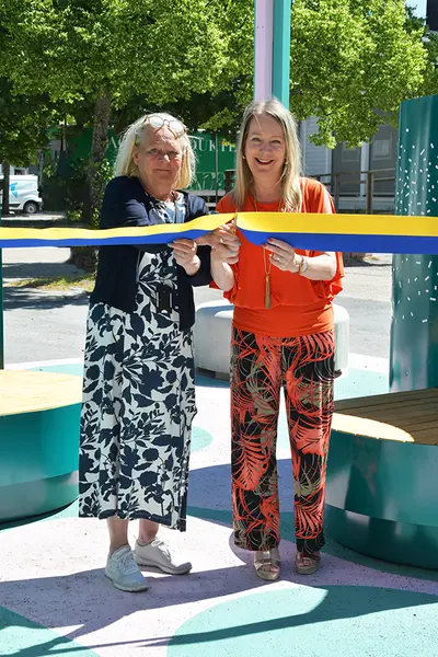 Här klipper kommunalråden Anki Svensson (M) och Anita Matsson (S) bandet och inviger det tillfälliga torget.