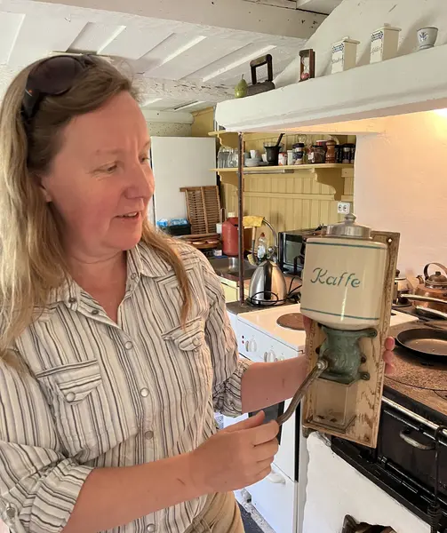 Karin visar en gammal kaffekvarn som är ärvd efter Tomas mamma. Passar fint i det gamla torpet.