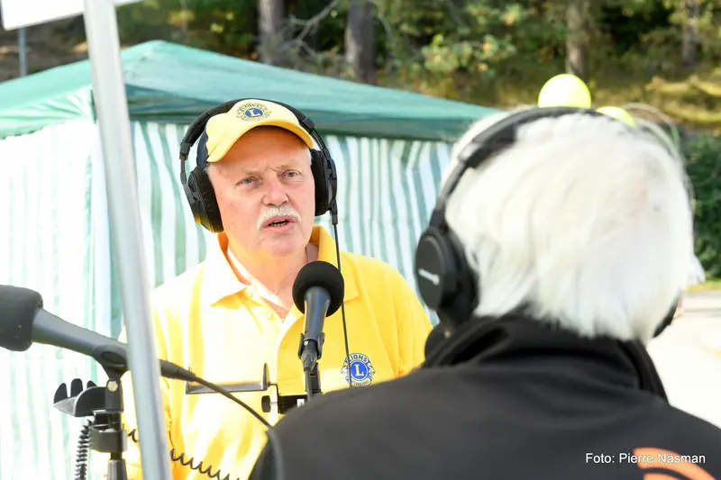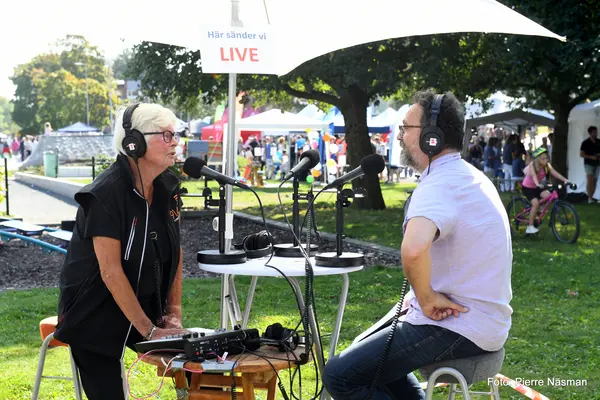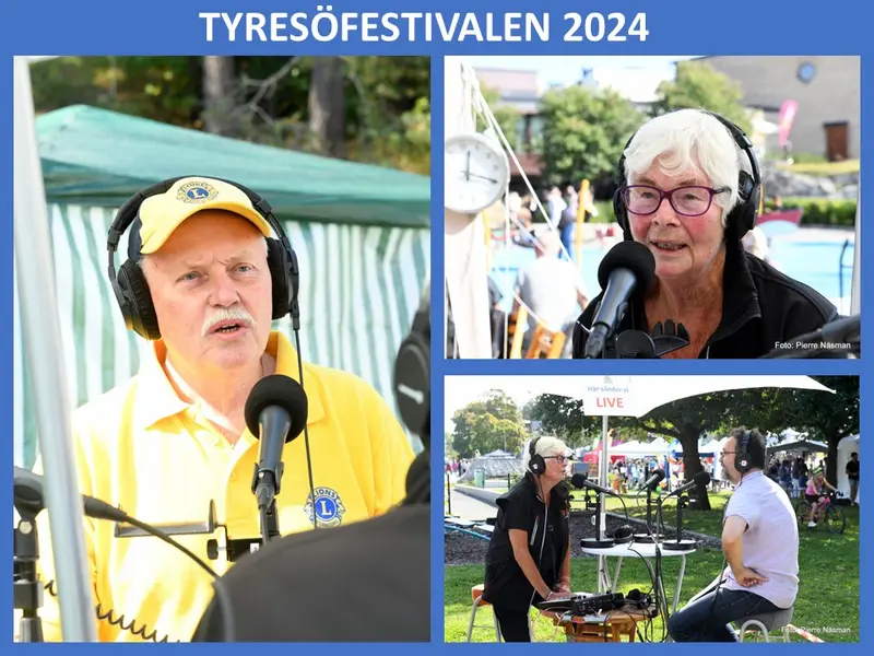 Gunnel Agrell Lundgren intervjuar Carl-Olof Strand från SeniorNet, Miguel Escribano från Tyresö Konstförening och Robert Engström från Lions Club Tyresö. Ett av många program som spelades in när Tyresöradion sände LIVE i fem timmar under Tyresöfestivalen.