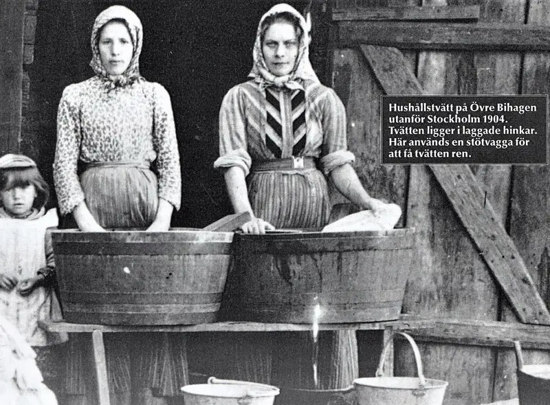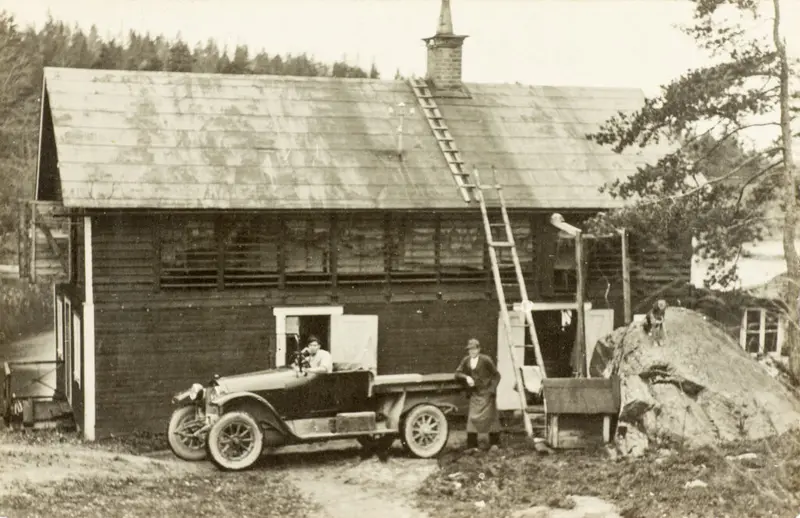 På bilden ser du Vikensbergs tvätteri. År 1926 hade de ersatt häst och vagn med en tjusig lastbil. Den står parkerad framför tvätteriet som har en övervåning för att hänga tvätt i. Titta noga så ser du tvätten som hänger på tork. Väggarna har nämligen brädor som går att vinkla, så att luften ska kunna cirkulera. Då torkade tvätten snabbare samtidigt som den kunde hänga under tak och få skydd mot regn och snö.
