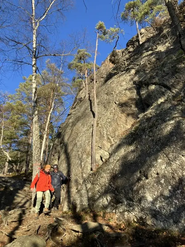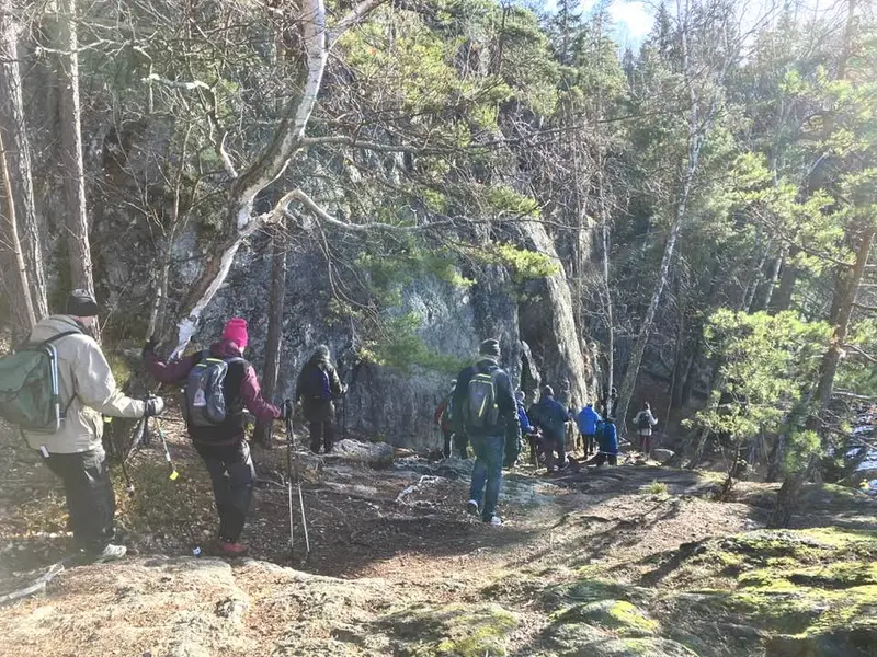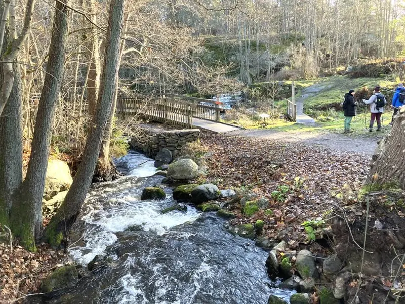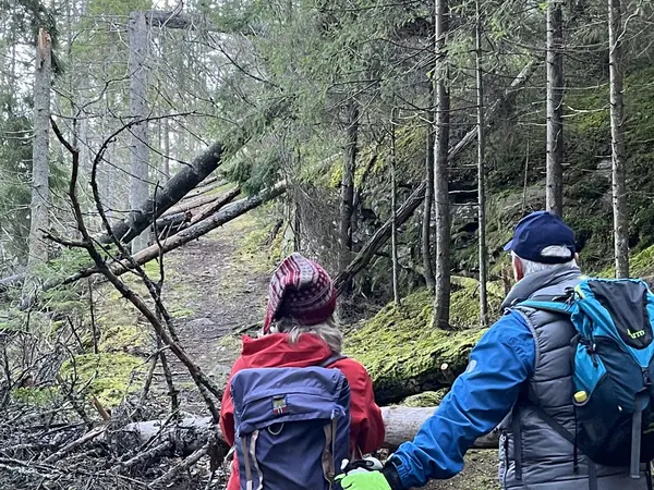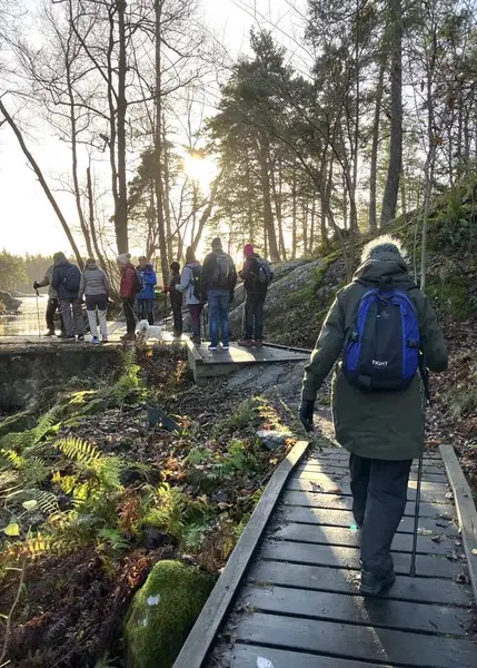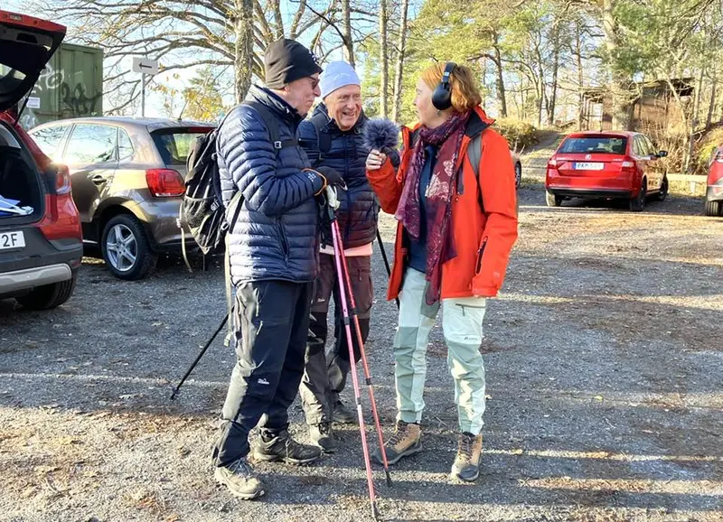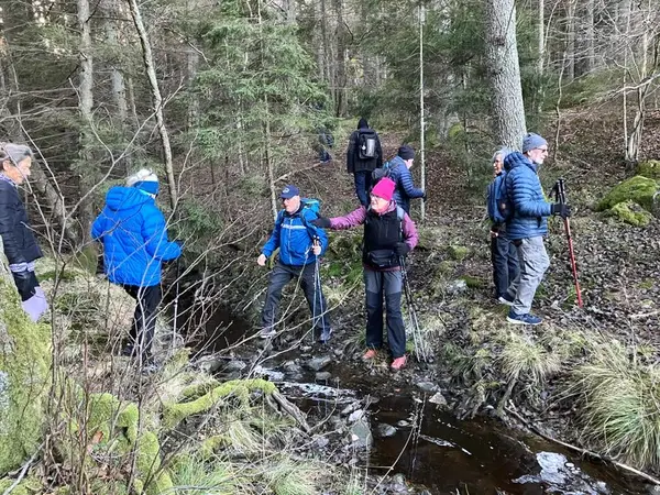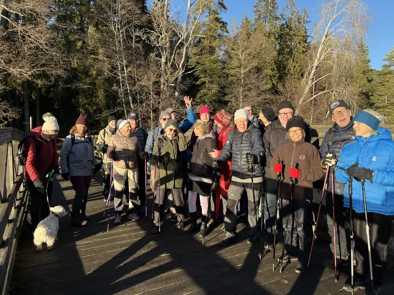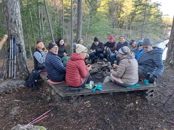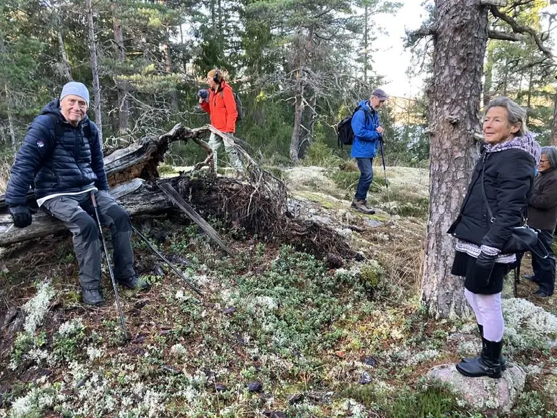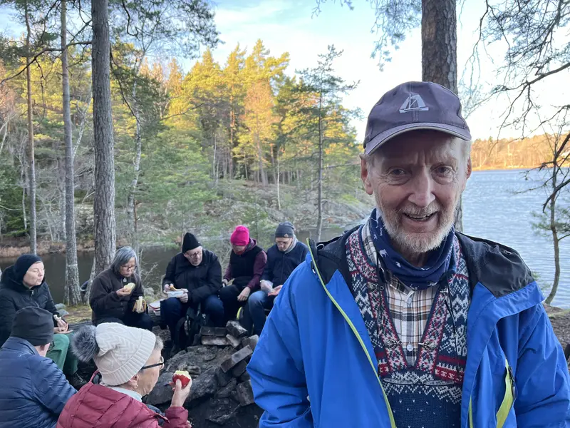 Bernt Karlsson leder en grupp som heter Älta Seniorvandrare varje vecka. De har vandrat varje torsdag sedan Covid började. Den här gången går de runt Tyresö-Flaten från Nyfors till Gammelström. De letar efter ett gammalt fornminne och fikar på ett vackert ställe på andra sidan sjön.