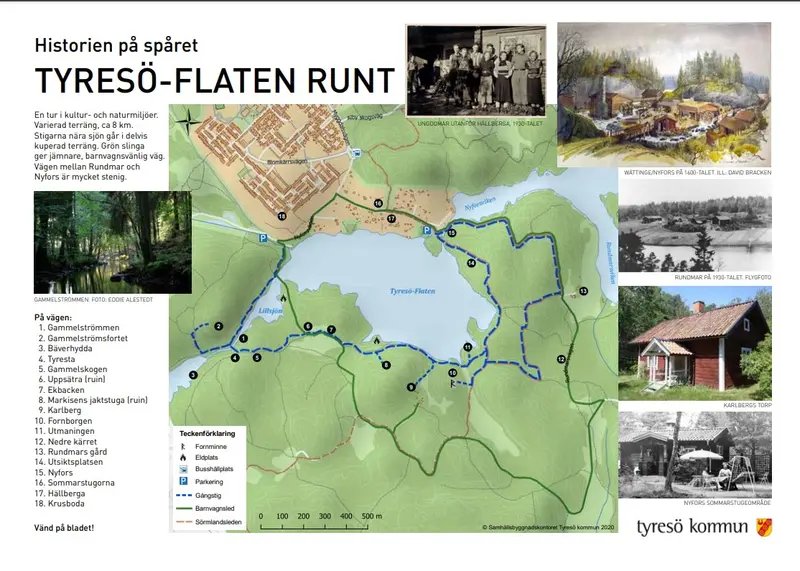 Historien på spåret är broschyrer man kan hämta på Tyresö bibliotek och få bra information vad man kan hitta. Här finns Historien på spåret Tyresö-Flaten runt.
