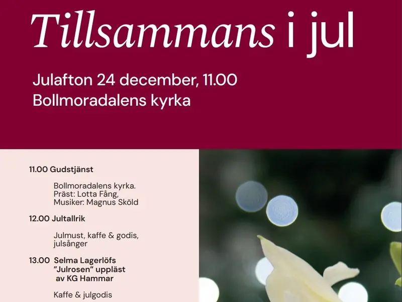 Kyrkoherde Rebecka Tudor-Sandahl och prästen Lotta Fång bjuder in till att fira julafton i gemenskap i Bollmoradalens kyrka. Anmäl dig här till jullunchen som serveras efter gudstjänsten. Förutom god mat får vi njuta av fika och underhållning i gott sällskap. Spelar i programmet gör Magnus Sköld.