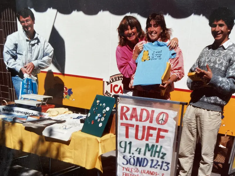 Reklam för Radio TUFF i Tyresö Centrum. I mitten syns Åkes livskamrat Monica Schelin och dotter Lena Sandin