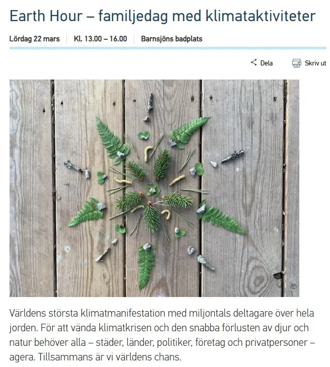 Lördagen den 22 mars uppmärksammar Tyresö kommun Earth hour – världens största klimatmanifestation. Tyresös egen prisade naturguide Martina Kiibus berättar om familjedagen vid Barnsjön kl. 13.00 - 16.00. Det blir fullt med aktiviteter för hela familjen med sagostund, lupptäcksfärd, bakning av stompabröd, information och mycket annat.