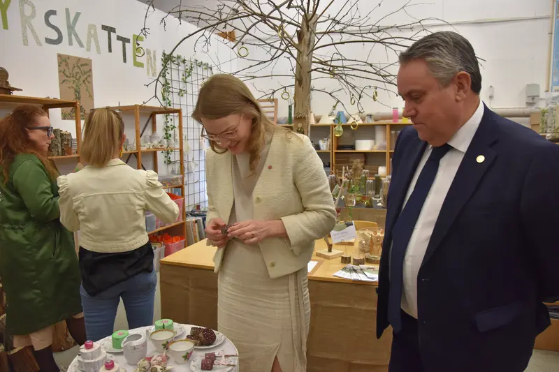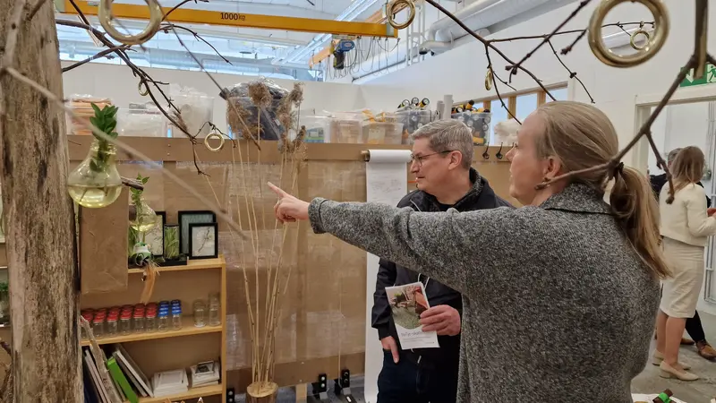 Kommunalråden Peter Frej (M) och Klara Watmani (S) tittar på utställning som ska inspirera pedagoger att skapa roliga saker av återbruksmaterial.