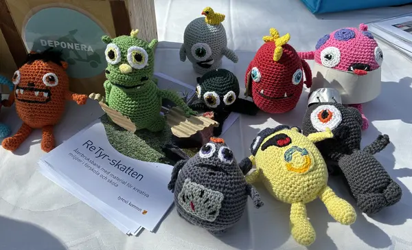 Några av sopsamlarmonstren som virkas på TYSA och används på förskolorna för att lära barnen återbruk och miljö.