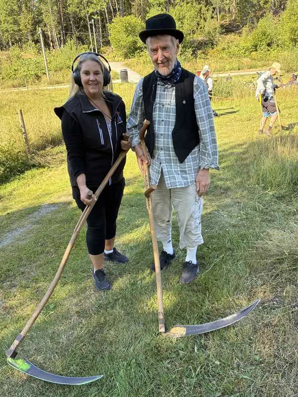 Carina får låna en lie och får prova att slå tillsammans med Bernt Karlsson.