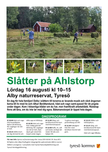 Slåtterdagen arrangeras av Tyresö Hembygdsföreing tillsammans med Tyresö Naturskyddsförening och Tyresö kommun.