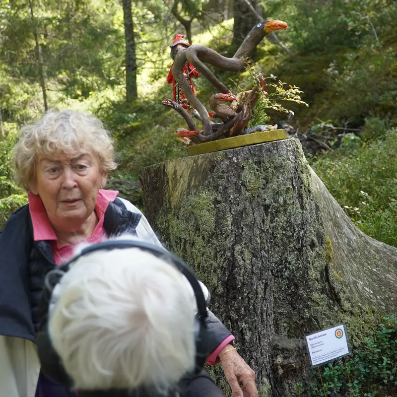 För sjätte året i rad visas Konstrundan i skogen i elljusspåret vid Alby friluftsgård. Efter invigningen i lätt duggregn gick konstnärerna runt banan med de besökare som ville och berättade om sina fantasifulla verk som anspelade på naturen och människan. Utställningen är öppen för alla dygnet runt i ur och skur till den 7 september. Gå och titta! Gläds och förundras, prata och skratta. Både själen och kroppen får motion. Fotona är tagna av Sanna Hagström som också höll invigningstalet och Gunnel Agrell Lundgren. Flera fina bilder finns på Facebook.