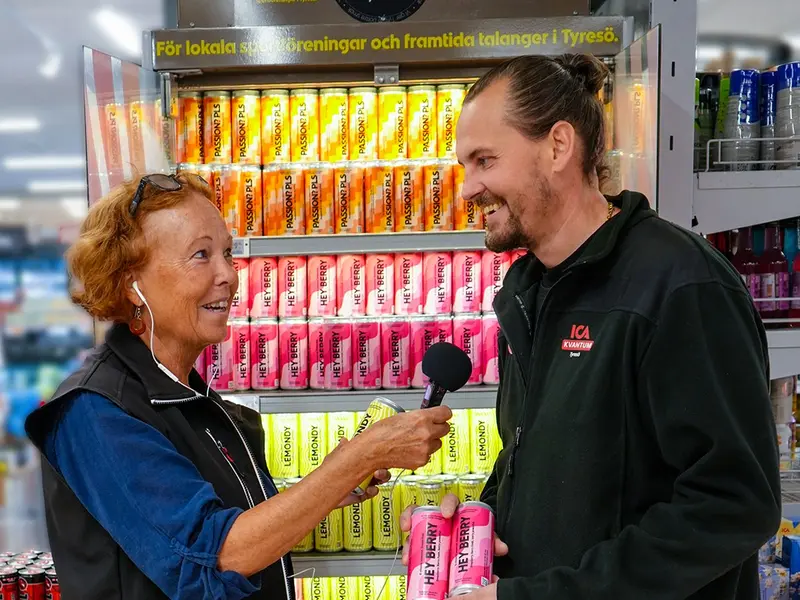 Fredrik Gull på ICA Kvantum Tyresö berättar om hur de har tagit fram en egen vitamindryck och hur idén föddes när de såg hur många unga som idag dricker energidrycker. De ville skapa ett bättre alternativ - en läskande vitamindryck med B-vitaminer och magnesium. Utan koffein, utan socker och utan energihöjande ämnen. Ann Sandin-Lindgren testade den goda drycken. För varje såld burk går en del av intäkterna direkt till lokala sportföreningar här i Tyresö.