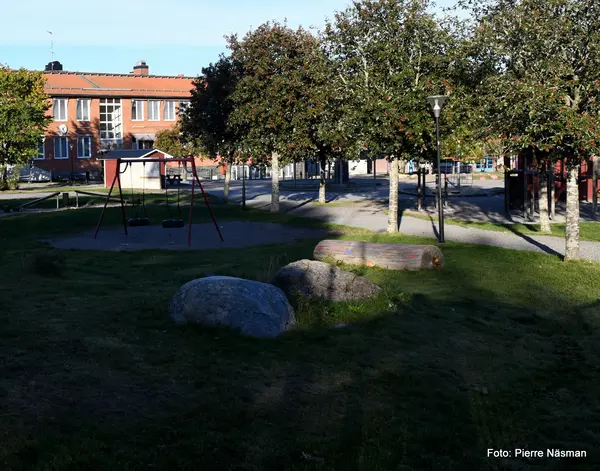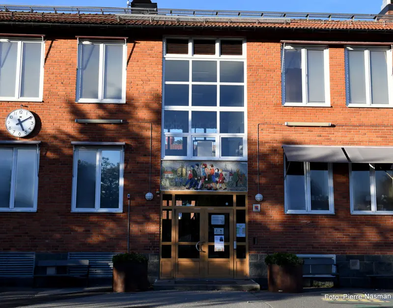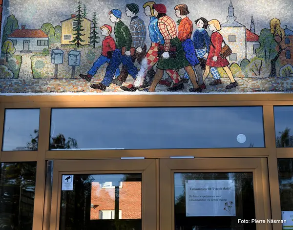 Konstverk av mosaik över huvudentrén gjort av Björn Jonsson.
