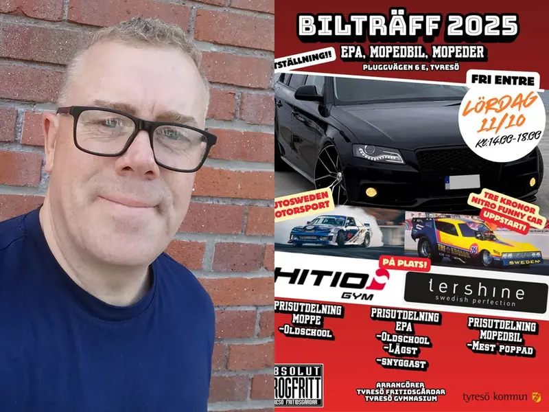 Alexander Nielsen samtalar med Marcus Wålm om den Bilträff 2025 som anordnas för motorintresserad ungdom den 11 oktober kl. 14-18 vid Nyboda skola. Det är Tyresö fritidsgårdar i samarbete med Tyresö Gymnasium som ordnar en träff för EPA, mopedbilar, mopeder och gamla bilar. Det blir prisutdelning, korv mm.