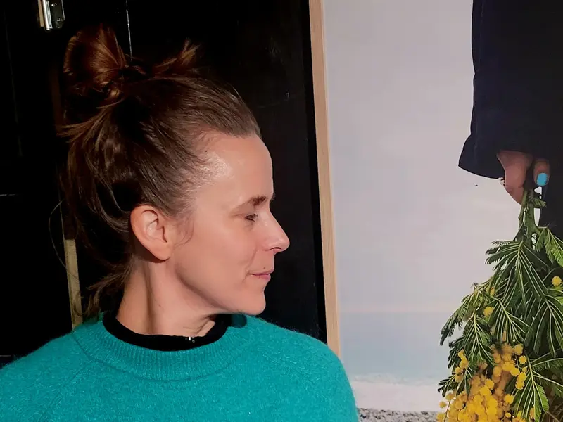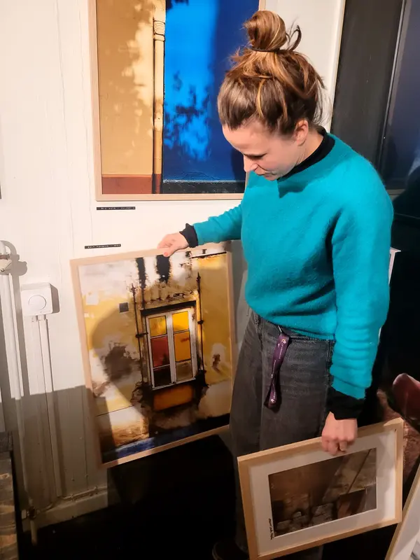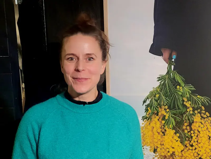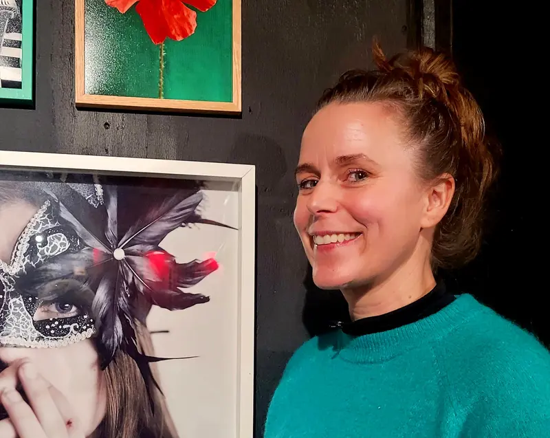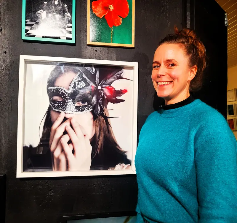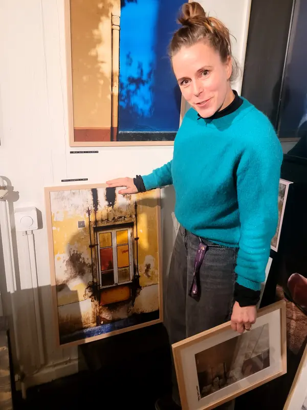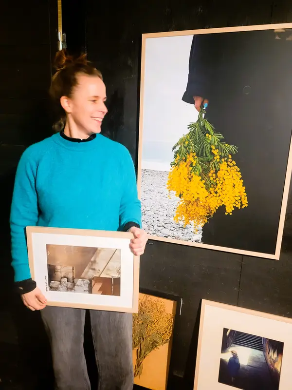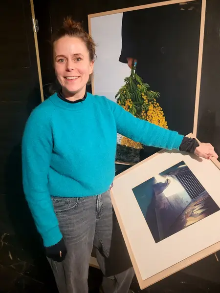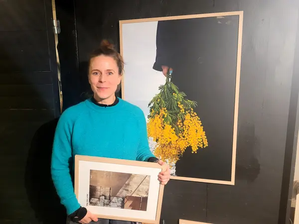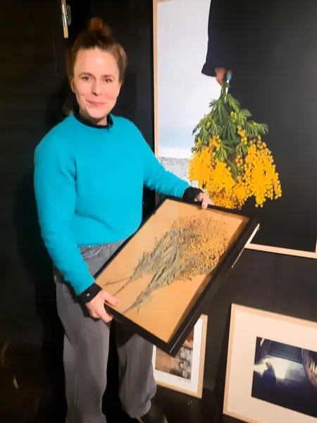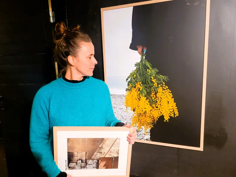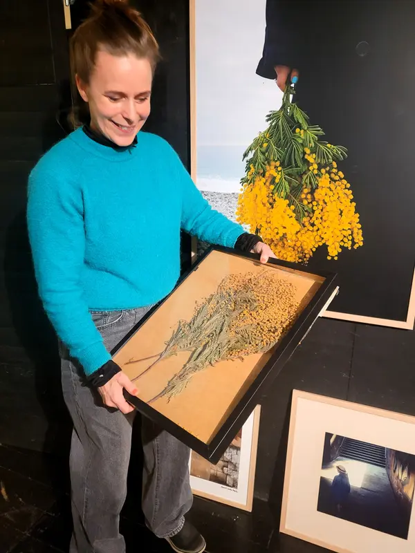 Fotograf Anna Ledin Wirén med ett av sina fotokonstverk. I bakgrunden syns mimosatavlan.