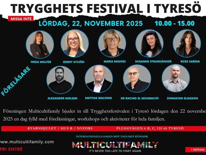 Föreningen Multicultifamily bjuder in till Trygghetsfestivalen i Tyresö lördagen den 22 november 2025 kl. 10-15 i Kvarhjulet Nyfors-salen. En dag fylld med föreläsningar, workshops och aktiviteter för hela familjen.