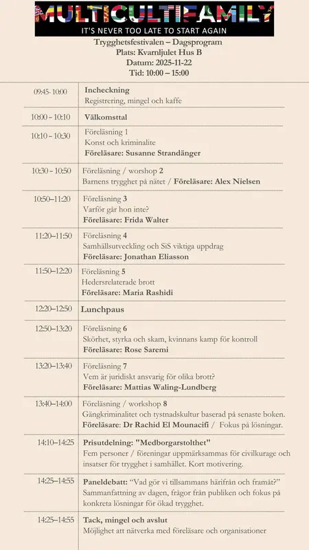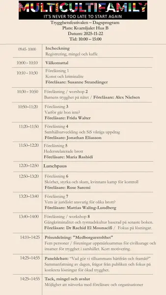 Rachid El Mounacifi med sin förening Multicultifamily bjöd in till en Trygghetsfestival på Kvarnhjulet i Tyresö lördagen den 22 november. En välbesökt festival med föreläsningar, möten och diskussioner.