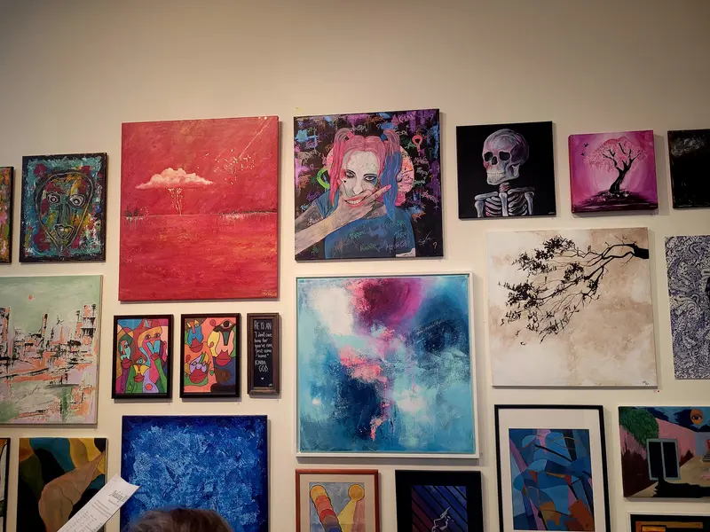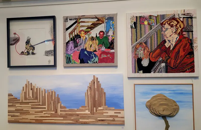 En annan vägg på Julsalongen 2025. Här syns Bo Frösslings tavlor av träribbor. Träkollage?
