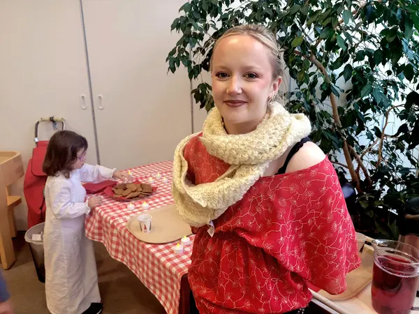 Glöggvärdinnan Tova bjuder på glögg och pepparkaka
