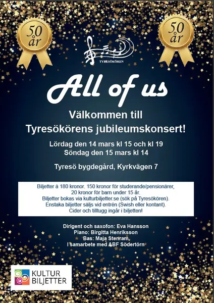 Tyresökören har fyllt 50 år och firar det med tre konserter i Tyresö Bygdegård lördagen den 14 mars kl.15 och kl.19 samt söndagen den 15 mars kl. 14.