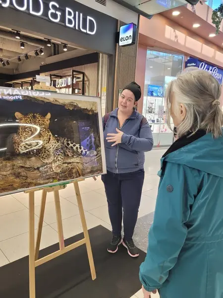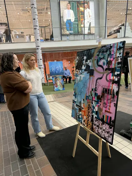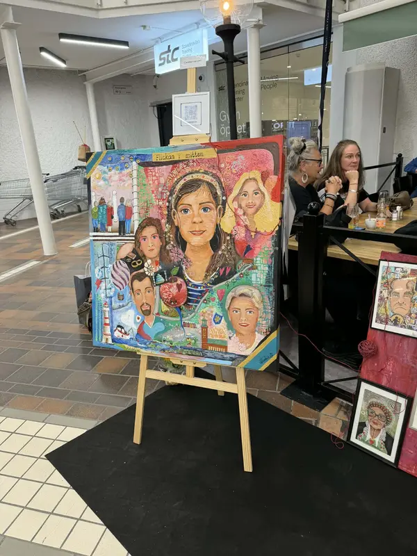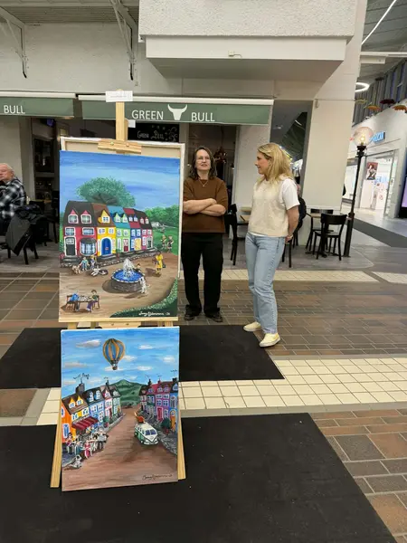 Ann Sandin-Lindgren gick runt på Vårsalongen 2026 med sina två barnbarn Alva 6 år och Lova 3 år och tittade på de 40 konstnärer som fick ställa ut mitt i Tyresö Centrum. Det var både professionella konstnärer och många glada amatörer som ställde ut och berättade om sina konstverk. Konstföreningens Ewa Kinnunen var en av de 300 konstnärer som hade ansökt om att få ställa ut och som fick en av platserna.