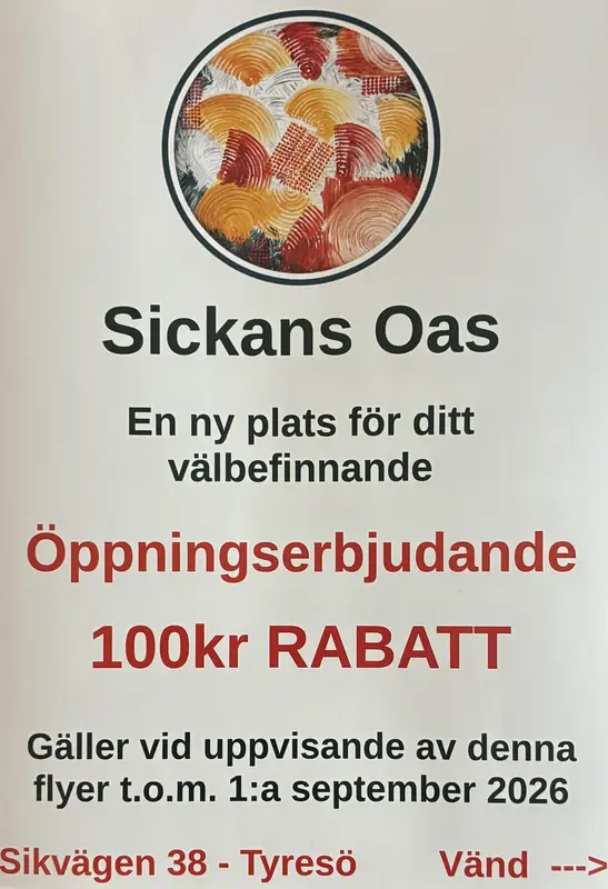 På Sikvägen 38 NB finns en ny skylt på gaveln där det står Sickans Oas. Ann Sandin-Lindgren som i flera år gått till Hälsoteamet för att sätta sig i en IR-bastu regelbundet besökte Sickan Ackerfeldt i hennes nya lokal dit hon har flyttat. Sickan berättar om de behandlingar hon har som lymf-, gravid-, ansikts-, helkropps- och fotmassage. De samtalar också om hur IR-bastun och parrafinbadet fungerar, något som Ann testat på tidigare.