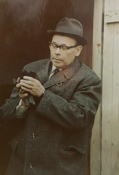 Peters farfar Arthur Eriksson med fågel som flugit in i huset, 1970