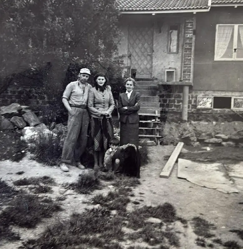 Peters farföräldrar Arthur och Maj Eriksson vid det nästan färdiga huset på Öringe Strandväg, ca 1955. Den tredje personen är en av Majs systrar, barnet är Arthur och Majs yngsta son Bengt (och hunden man knappt ser hette Pia).