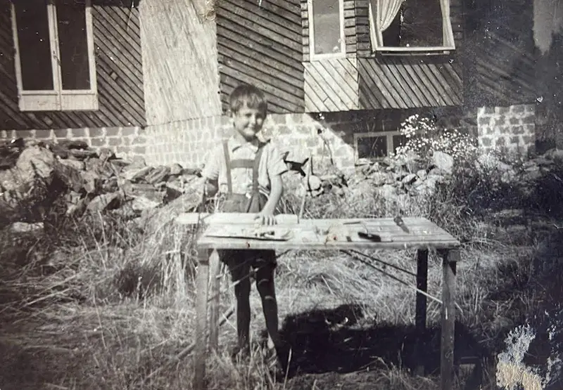 Peters far Hans Eriksson hjälper till med snickrande på huset på Öringe Strandväg, tidigt 50-tal