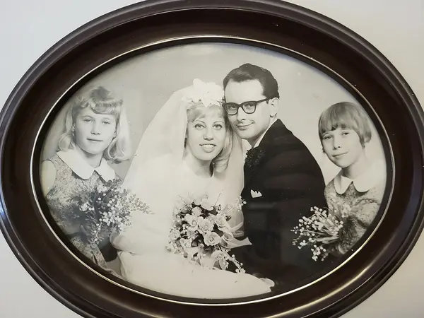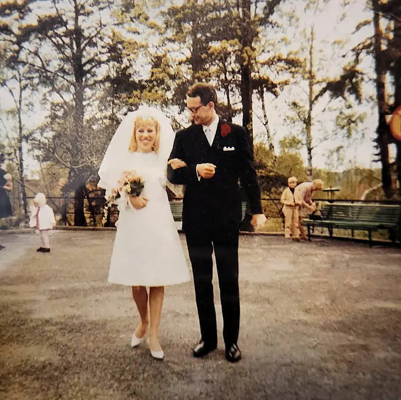 Peters föräldrar Hans och Aina Eriksson 1968. Brudtärnor är systerdöttrarna Lena och Ann-Charlotte (“Totta”).