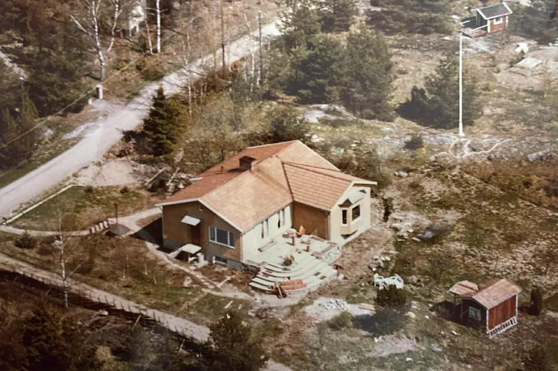 Det färdiga huset på Öringe Strandväg 19 sett från luften. Troligtvis andra halvan av 60-talet eller tidigt 70-tal.
