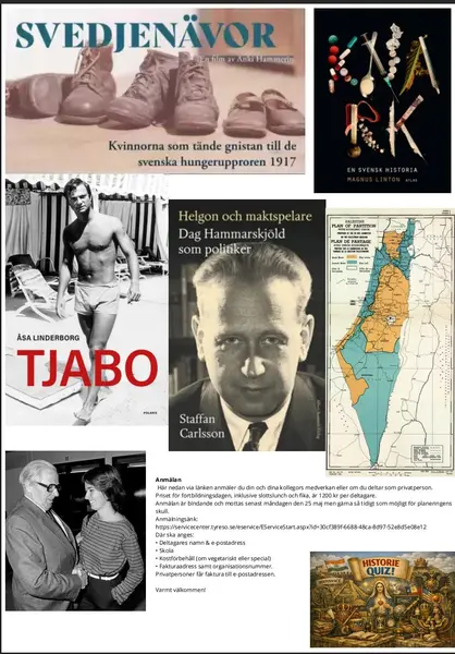 Fredagen den 5 juni är det dags igen för historia på Tyresö slott för Sveriges lärare och privatpersoner med intresse för historia. Ann Sandin-Lindgren samtalar med initiativtagaren Mats Fält (M) och historikern Martin Englund från Södertörns högskola om programmet som inleds av Staffan Carlsson som pratar om Dag Hammarskjöld. Åsa Linderborg berättar om kungen utifrån sin bok Tjabo, Magnus Linton diskuterar svensk narkotikahistoria och Kjell Östberg presenterar sin aktuella bok om Socialdemokratin. Historikerna Johannes Heuman och Pontus Rudberg som på ett grundläggande sätt förklarar Israel-Palestina-konfliktens historiska rötter.
