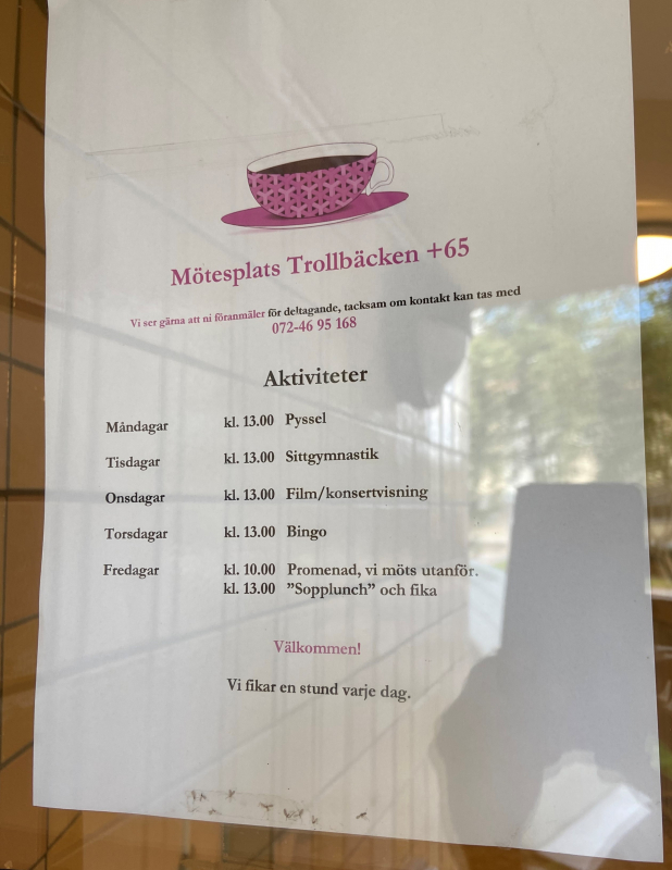 På "Mötesplats +65 Trollbäcken" samlas många äldre varje dag kl. 13-15 i Hemtjänstens lokaler på Kumla Allé 9. Gunvor Grundström och de andra deltagarna menar att man behöver större lokaler så det blir en riktig Träffpunkt som i Tyresö Centrum. De föreslår politikerna att ge biblioteket andra lokaler så att denna verksamhet kan expandera.