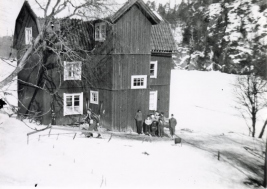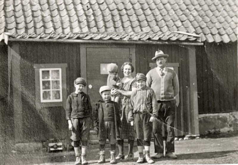 Familjen Lind. Bakre raden från vänster: Gösta och Bertil (med dragspel) Lind. Okänt vilka de två andra killarna i bakre raden är. Främre raden från vänster: Rolf, Sixten och Ingeborg Lind. Bilden är tagen vid Telegrafen, sannolikt 1941.
