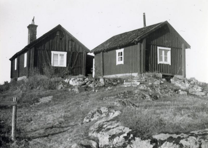 Husen i Raksta. I huset till vänster bodde familjen Lind och i det högra bodde Johan August Jonsson.