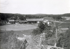 Tyresö gård i bakgrunden. Karolinahemmet längst ner till vänster och dess uthuslänga till höger. Fotot taget från kyrktaket. Bild är sannolikt tagen 1941.