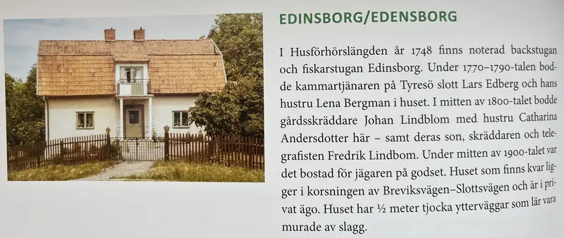 En arkivpärla från 1996 då Åke Sandin intervjuar Anna-Lisa Willix (f. 1909) som var gift med Claes Willix om familjens historia. Om sin svärfar Anders Willix (f.1854) som arbetade som skogsvaktare åt markis Lagergren och fick 12-13 barn varav inte alla överlevde. Om hur Claes och Anna-Lisa renoverade Edinsborg vid Tyresö Slott.
